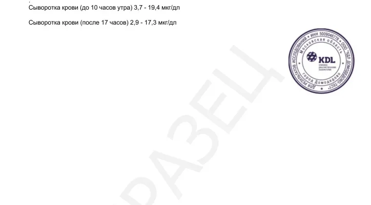 | Кровь (утренняя) | 100-400 нг/мл | Нормальный уровень; возможны отклонения при стрессах или болезнях |
